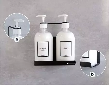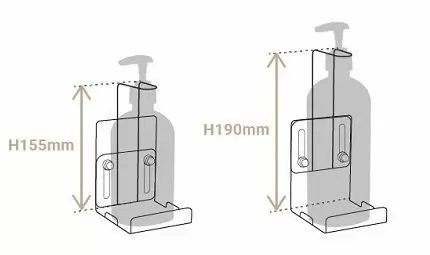 Ce support dispose d'un système de fil réglable pour s'adapter à une large gamme de bouteilles d'amenités de marque.Il peut accueillir des bouteilles jusqu'à 75 mm de diamètre et des hauteurs de pompe de 155 mm à 190 mm — y compris des formats populaires comme les bouteilles Aesop. Le design ajustable permet une installation et un remplacement rapides et sécurisés des bouteilles, tandis qu'un simple mécanisme de pression maintient les bouteilles en place.