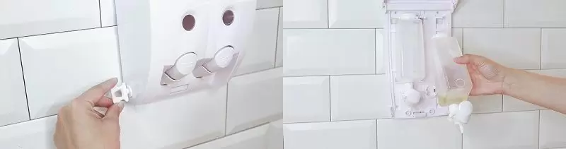 การออกแบบแพคเกจสบู่และแชมพูที่ง่ายและสไตล์เพื่อให้ความปลอดภัยให้กับสินค้าภายในและมีภาพสินค้าชัดเจนภายนอกกล่อง ทุกชุดมาพร้อมคู่มือการใช้งานและชุดติดตั้งรวมถึงสกรู ตะแกรง เทปกาวและซิลิโคน